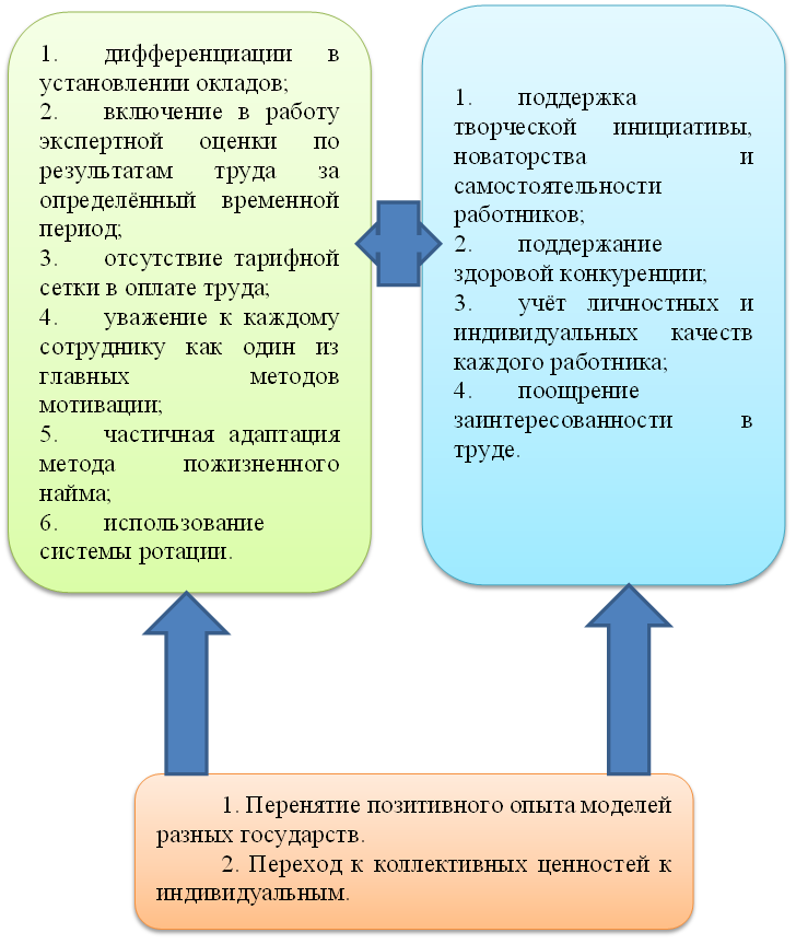 В исследованиях И.М. Гуровой говорится о том, в мировом опыте управления персоналом одну из самых важных частей занимает мотивация. При этом исследователь говорит о том, что в российскую модель нельзя просто взять и внедрить в российскую действительность, так как она не даст эффективного результата. Для этого в России должны быть созданы свои организационно-правовые условия [1, с. 106].
