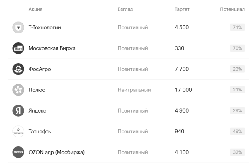 Кратко проанализируем его современное состояние. Так, по-прежнему среди лидеров индекса – IT-компании, агропромышленный сектор, а также добыча и переработка полезных ископаемых. Из первой семерки компаний – держателей акций-фаворитов лишь у «Полюса» нейтральный статус при таргете в 17 000 и самый низкий, по оценкам экспертов, потенциал. Наиболее успешным же вновь стали «Т-Технологии», которые удерживают лидерство в рейтинге уже продолжительный период (рисунок 1).