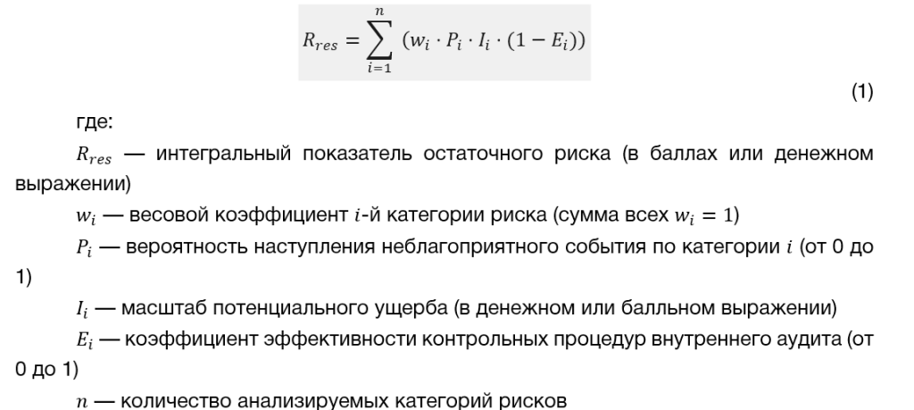 Для формализации влияния аудита на устойчивое развитие применяется математическое моделирование. Оценка эффективности контрольной среды рассчитывается через формулу интегрального остаточного ESG-риска ф-ла.1: