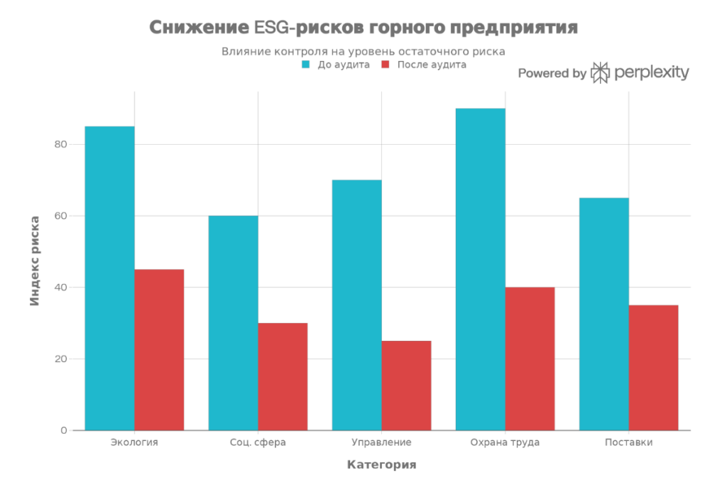 Внутренний аудит является ключевым механизмом обеспечения устойчивого развития горнодобывающих предприятий в условиях возрастающих требований к ESG-показателям. Математическое моделирование и эмпирические данные подтверждают, что систематический аудит снижает интегральный уровень остаточных рисков в среднем на 52.7%, причем максимальный эффект достигается в областях корпоративного управления (64.3%) и охраны труда (55.6%).