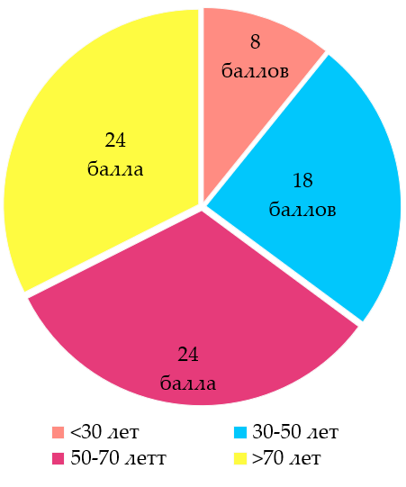 Группы 50-70 лет и старше 70 лет: средний ИК – 24 балла.