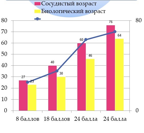 Как показало исследование, между этими двумя интегральными показателями существует сильная прямая зависимость. Пациенты с повышенным сосудистым возрастом, как правило, имели и повышенный биологический возраст, и наоборот.