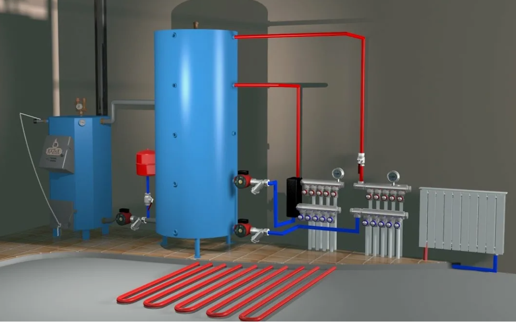 Теплоаккумулирующая установка, интегрированная в систему теплоснабжения жилого дома, представляет собой техническое решение, позволяющее временно накапливать избыточную тепловую энергию и использовать её в периоды повышенного спроса или отсутствия внешнего источника тепла (Рис. 2). Такая установка может быть выполнена в виде буферного водяного аккумулятора, модуля на основе фазопереходного материала или гибридной системы, сочетающей несколько принципов аккумуляции. В условиях частного или малоэтажного домостроения теплоаккумулятор обеспечивает стабильную подачу тепла при работе с солнечными коллекторами, тепловыми насосами или твердотопливными котлами, устраняя их цикличность и повышая общую эффективность.