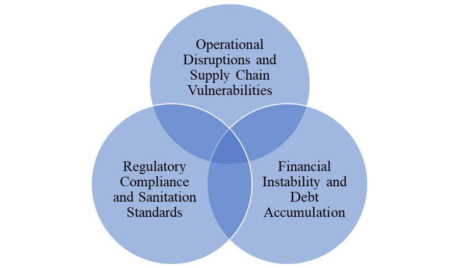 Instances of Operational Disruptions and Supply Chain Vulnerabilities, Financial Instability and Debt Accumulation, and Regulatory Compliance and Sanitation Standards exacerbate these challenges.