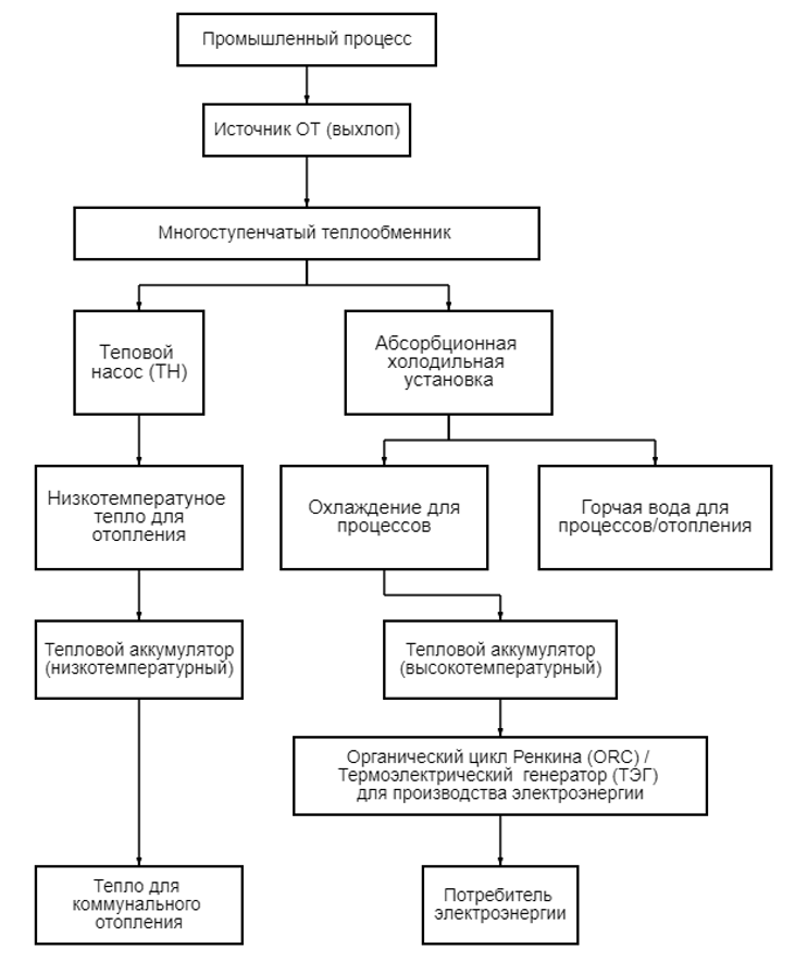 Для более четкого представления о процессе утилизации отработанного тепла, предлагается ознакомиться со следующей схемой (рис. 1), которая демонстрирует основные этапы и элементы системы, включая различные преобразователи и потребителей.