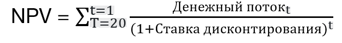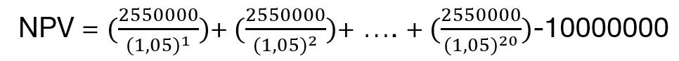 Где t = год работы, до 20 (T) лет работы. В данном случае, имея 20 лет эксплуатации с годовым потоком в 2.55 млн, NPV составит: