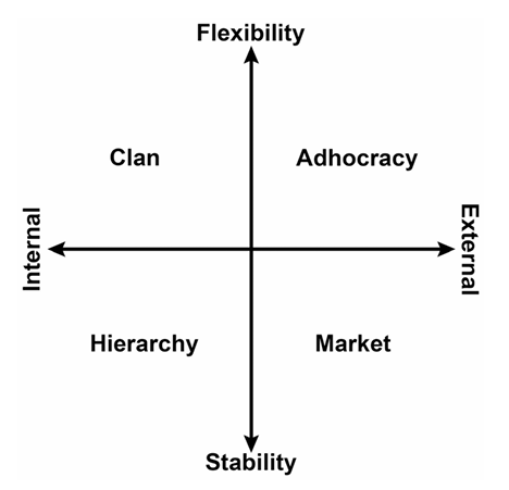 The research found six main dimensions which formed the basis of their framework on organizational culture: dominant cultural characteristics, organizational leadership, employee management, organizational glue, strategic emphasis and criteria for success. These categories introduced two principal cultural dimensions, each with a competing value. The first dimension is determining if a company’s culture is internally or externally focused. The second dimension is whether organizations played with flexibility or with stability. When placed on two axes, these two dimensions form four quadrants, each representing a distinct set of organizational effectiveness indicators. A graphical display of the competing values framework can be found in Figure 1 [2].