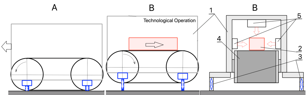 A new technical solution is that the conveyor belt can be used both to transport workpieces and to autonomously move the process module itself. The process module can use the conveyor for its own movement if the supports are folded (position A). Or it can move the workpiece when the supports are fully extended and the process module body is in position B.