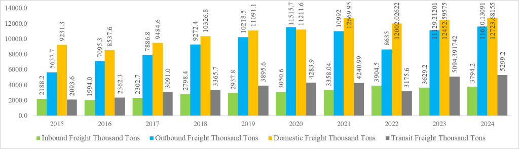 Global trends in the transport sector increasingly prioritize environmental sustainability, and under the framework of the “Green Transition,” it has become essential to reduce road congestion, reduce greenhouse gas emissions, develop efficient logistics systems, and shift cargo transport from road to rail, thus positioning rail freight as a key component and prompting developed countries to emphasize the railway sector in their transport policies. As noted by Bianca Pascariu (2025), the increasing importance of rail freight is making it an integral part of the transport system. Ulaanbaatar Railway Joint Venture Company (UBTZ JVC), which occupies a key position in the social and economic sector of Mongolia, has experienced growing demand for railway transport in recent years. While the company transported approximately 21-22 million tons of cargo annually during 2014–2017, this volume increased steadily, reaching 33.4 million tons in 2024.