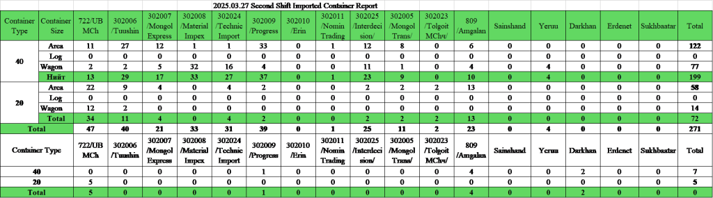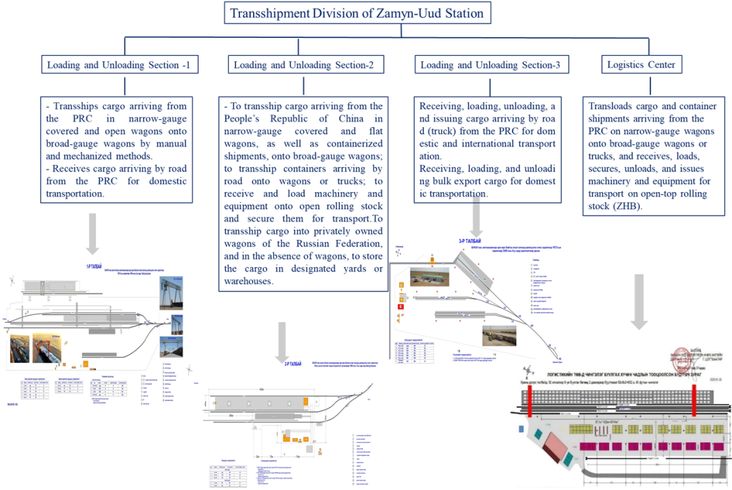 Within the Transshipment Division, Yards 1, 2, and 3 handle operations such as transferring cargo from narrow-gauge covered or flat wagons and container shipments onto broad-gauge wagons; transferring containers arriving by truck onto wagons or trucks; receiving and loading technical equipment and machinery onto open rolling stock; securing, unloading, issuing, and storing cargo; preparing transport and accompanying documents; handling financial issues; reporting; and overall organization of these operations (Technological Regulations of Zamyn-Uud Station, 2025).