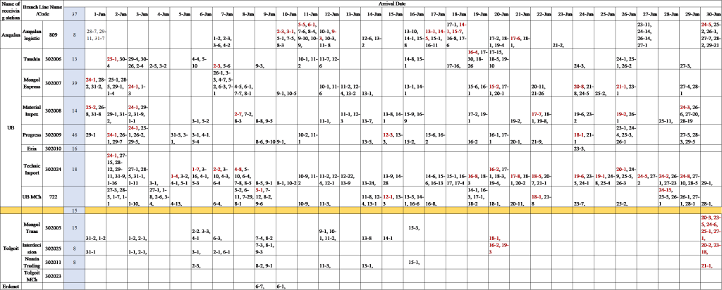 At UBTZ JVC stations, there are 12 companies with open, rail-connected, customs-controlled loading and unloading yards for container transportation operations. More than 300 companies without their own loading and unloading areas receive cargo at these authorized yards. Containers arriving by narrow-gauge wagons or trucks are loaded onto wagons according to the branch line owner’s code (e.g., 302007, 302001), grouped by the month and year of arrival and the branch line of unloading (Figure 4).