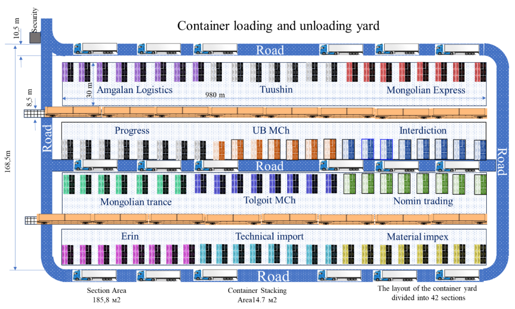 Abstract: In recent years, the Government of Mongolia has planned and implemented measures to increase the extraction, export, and import volumes of mining products, accelerate industrialization, establish additional energy sources, and improve railway transportation operations. To enhance the efficiency of railway transport processes, this work analyzes the optimal organization of wagon loading according to train marshalling plans at freight yards and explores ways to improve the coordination of shunting operations. The study applies process management theory, with a focus on cargo flow optimization, to assess the feasibility of introducing new loading technologies at Zamyn-Uud station. Using historical data, the study determined the number of incoming containers, the distribution of destination terminals, and the waiting times until unloading sidings were cleared. Based on these parameters, a simulation model was developed in Python. Simulation results indicate that marshalling trains according to the FIFO principle and zone-based allocation optimizes shunting operations, improves utilization of unloading fronts, and significantly reduces both waiting times and total operational costs. The data-driven simulation approach provides a practical method for enhancing container transport organization by rail, increasing yard capacity utilization, and effectively implementing process management approaches in loading and unloading operations.