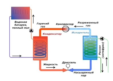The external circuit is an underground or submerged pipeline that is used to circulate antifreeze. The second circuit, which uses the refrigerant, includes an evaporator and condenser heat exchangers, a compressor and a throttle that controls the refrigerant pressure. The expansion of the compressor causes the pressure of the refrigerant to drop when it reaches the evaporator, where it boils and absorbs heat from the refrigerant to start a duty cycle. The compressor then sucks in the refrigerant gas, compresses it, heats it, and passes it into the condenser. Where it gives off heat to the water in the heating system. After condensation, the refrigerant re-enters the throttle, and the cycle repeats [2].