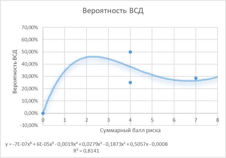 Зависимость вероятности ВСД от суммарного балла риска анализировалась с помощью полиномиальной регрессии 6-й степени. Качество аппроксимации оценено коэффициентом детерминации R2. Статистическая обработка включала расчет доверительных интервалов для вероятностей.