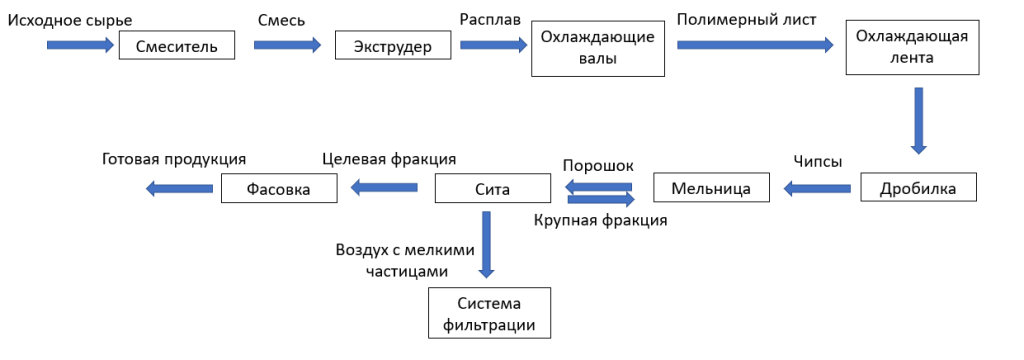 -измельчение чипсов, полученных в экструдере, на специальных мельницах;