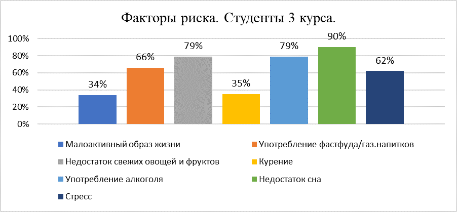 Среди студентов 3 курса самыми распространёнными факторами являлись также употребление фастфуда, газированных напитков, недостаток в рационе свежих овощей и фруктов, малоактивный образ жизни, курение, употребление алкоголя, недостаток сна, стресс. На недостаток сна обратили внимание 90% обучающихся, второе место по распространённости заняли недостаток в рационе свежих овощей и фруктов и употребление алкоголя (79%), на третьем месте употребление фастфуда и газированных напитков (66%), стресс (62%) на 4 месте, на 5 месте курение (35%), на 6 месте малоактивный образ жизни (34%). (Диаграмма 2).