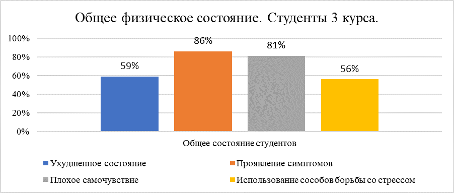 Среди студентов 3 курса намного чаще проявляются признаки хронического стресса 31 человек (86%), они самостоятельно отмечают ухудшение самочувствия 21 человек (59%). Малая доля студентов ощущают себя оптимистами и полны сил, а все остальные отмечают истощение и повышение тревожности 29 человек (81%). Повышается количество обучающихся, которые занимаются спортом, появление хобби для снижения стресса отметили 20 человек (56%) (Диаграмма 4).