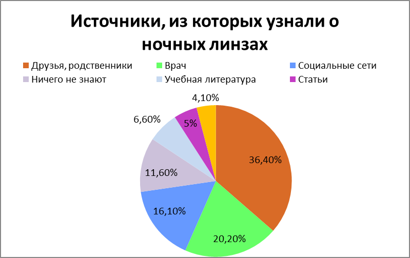Главным источником информации про ночные линзы стали друзья и родственники — 88 студентов, это 36,4%; другие источники: врач — 49 студентов, это 20,2%; социальные сети — 39 студентов, это 16,1%, ничего не знают о них 28 студентов, это 11,6%, из учебной литературы — 16 студентов, это 6,6%, статьи -12 студентов, это 5% и другие источники — 10 студентов, это 4,1%.