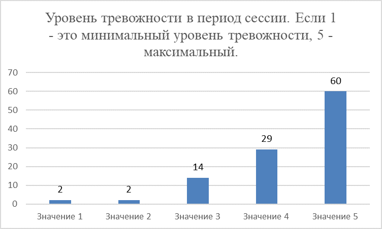 Студентам был задан вопрос: «Как бы вы оценили уровень тревожности в период самой сессии?» (который нужно было оценить по пятибалльной шкале) Результаты показали, что значительная часть студентов — около 60 человек (56,1%) — испытывает высокий уровень тревожности именно в период самой сессии. 29 человек (27,1%) оценили уровень своей тревожности в 4 балла. 14 человек (13,1%) сказали, что испытывают средний уровень тревоги в период самой сессии, что оценивается в 3 балла. 2 человека (1,9%) оценили тревожность в 2 балла. В 1 балл уровень тревожности в период самой сессии оценили также 2 человека (1,9%) (Диаграмма 1).