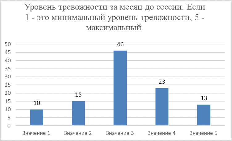 По данным ответов на вопрос: «Как бы вы оценили свой уровень тревожности за месяц до сессии?», установлено, что 13 студентов (12,1%) испытывают высокий уровень тревоги, задолго до сессии, что указывает на необходимость оказания поддержки этой группе людей. Длительная повышенная тревожность может существенно негативно сказаться на результатах экзаменов и психологическом состоянии студентов. 23 человека (21,5%) оценили свой уровень стресса за месяц до сессии на 4 балла. Большинство студентов, а именно 46 человек (43%) ответили, что их тревожность оценивается в 3 балла. Эти студенты находятся в зоне риска, что также требует внимания со стороны преподавателей и служб психологической поддержки. 15 человек (14%) практически не испытывает тревогу перед сессией, это 2 балла. А 10 человек (9,3%) испытывают минимальный уровень тревоги, это 1 балл. (Диаграмма 3).