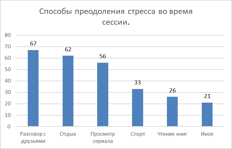 В результате опросе было выяснено какие способы для борьбы со стрессом используют студенты в период сессии. Был задан следующий вопрос: «Как вы справляетесь с волнением и стрессом во время сессии?» Полученные данные говорят о том, что для большинства, 67 человек (25,3%), главным методом расслабления, является общение с друзьями, 62 студента (23,4%) предпочитают просто отдых, 56 человек (21,1%) выбирают просмотр сериала, как способ борьбы со стрессом, 33 студента (12,5%) выбирают занятия спортом, чтение книг предпочитают 26 человек (9,8%), 21 человек (7,9%) выбирают для себя другие способы. (Диаграмма 5).