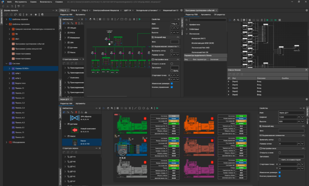 Визуализация данных цифрового двойника осуществляется в среде SCADA+, где оператор работает с несколькими уровнями представления информации: от структурного дерева проекта до детальных экранов HMI и редакторов функциональных блоков. На Рисунке 2 показан рабочий интерфейс системы, включающий дерево проекта слева, где организованы все компоненты – сервер, панели, оборудование, – и центральную область с редактором HMI, где формируются графические экраны с индикаторами состояния насосов, двигателей и технологических параметров. В правой части виден редактор FBD – функциональных блоков, где программист создаёт алгоритмы обработки сигналов и принятия решений. Такая структура позволяет одновременно проектировать, тестировать и эксплуатировать систему, обеспечивая полный цикл разработки от схемы до визуализации. Особенно важно, что все элементы – от датчиков до кнопок управления – имеют единое представление в проекте, что минимизирует ошибки при внедрении.