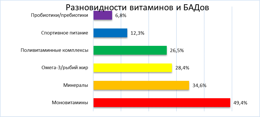 Среди разновидностей витаминных комплексов и биологически активных добавок (БАД) лидировали моновитамины (витамин D, витамин C и др.), которые использовали 49,4% опрошенных. Поливитаминные комплексы («Компливит», «Витрум» и аналоги) предпочитали 26,5% респондентов. Минеральные добавки (магний, железо, цинк) и омега-3 принимали 34,6% и 28,4% студентов соответственно. Наименее востребованными оказались пробиотики (6,8%) и спортивное питание (12,3%), причем последнее было значительно популярнее среди юношей (25,0%) по сравнению с девушками (10,3%). (Диаграмма 1).