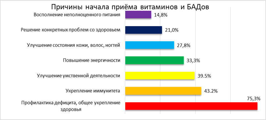 Ведущим мотивом приёма БАДов стала профилактика дефицитных состояний и общее укрепление здоровья – эту причину указали 75,3% потребителей. Значительная часть респондентов также ориентировалась на укрепление иммунитета (43,2%) и улучшение когнитивных функций – памяти, концентрации внимания (39,5%). Повышение работоспособности и борьба с утомляемостью были важны для 33,3% опрошенных, а улучшение внешнего вида (состояния кожи, волос, ногтей) – для 27,8% респондентов, с выраженнымгендерным дисбалансом: 30,3% девушек против 12,5% юношей. Каждый пятый (21,0%) принимал добавки по конкретным медицинским показаниям после консультации с врачом.(Диаграмма 2).