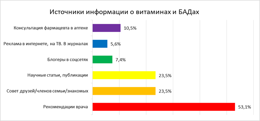 Основным источником информации о БАДах выступили рекомендации медицинских специалистов: на них полагались 53,1% студентов. При этом среди старшекурсников (5-6 курсы) эта доля достигала 66,7%, тогда как среди студентов младших курсов (1-2 курс) – лишь 46,8%. Научные публикации служили источником знаний для 23,5% респондентов, советы знакомых – для 23,5%. Консультации фармацевтов в аптеке были значимы для 10,5%, тогда как влияние блогеров и рекламы оставалось незначительным (7,4% и 5,6% соответственно).