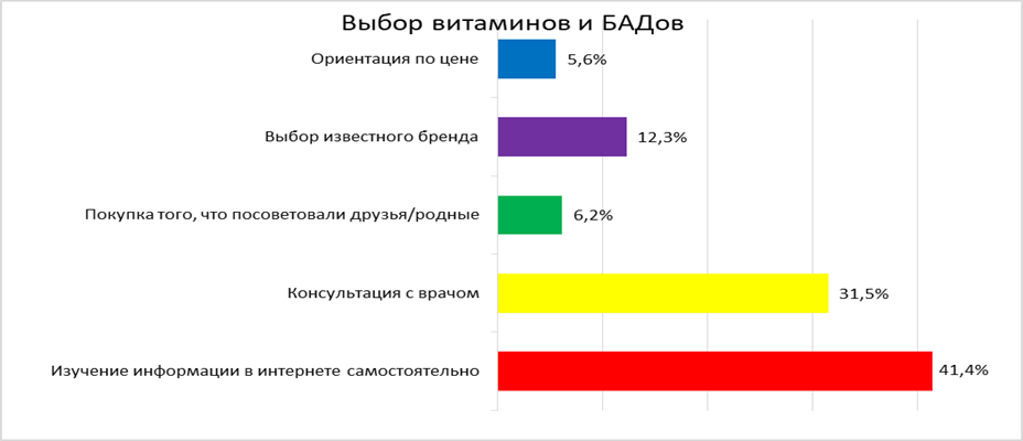 При выборе препаратов 41,4% студентов самостоятельно изучали информацию в интернете, 31,5% обязательно консультировались с врачом, а 12,3% ориентировались на известность бренда. Для незначительной части респондентов решающими были ценовой фактор (5,6%) или рекомендации друзей и родственников (6,2%).