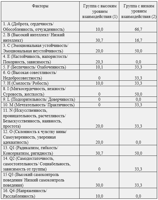 Далее в каждой из изученных групп мы провели тестирование для выявления выраженности различных личностных качеств. В таблице 1 приведен процент сестер с низкой долей выраженности перечисленных факторов в двух сравниваемых группах: первой, имеющей средний уровень взаимодействия, и второй – с низким уровнем взаимодействия. Отметим, что практически по всем факторам имеются выраженные отличия в обеих группах. Например, если доля сестер, отличающихся обособленностью (отчужденностью) (фактор А) во второй группе составляет 66,7%, то в первой – только 10,0% (р=0,027). Низкой эмоциональной устойчивостью (фактор С) отличаются 50,0% сестер второй и 20,0% — первой группы. Сестрам с низким уровнем взаимодействия в большей степени свойственны такие черты, как зависимость, озабоченность, недобросовестность, робость наряду с жесткостью, практичность с наивностью и самоуверенностью, консерватизм, зависимость от группы, определенная расслабленность. Сестры со средним уровнем взаимодействия отличаются более высоким интеллектом, склонностью к чувству вины при некоторой напряженности. Важно отметить также, что в группе сестер с высоким уровнем взаимодействия отсутствовали низкие оценки по всем перечисленным факторам. Большинство из них добродушны, легки в общении, эмоциональны, готовы к сотрудничеству (у 55,6% высокий уровень выраженности фактора А); требовательны к себе, руководствуются чувством долга, настойчивы, берут на себя ответственность, добросовестны (у 55,6% высокий уровень выраженности фактора G). То есть, медицинские сестры с низким уровнем эффективности взаимодействия эмоционально неустойчивы, замкнуты, сконцентрированы на своих проблемах, они добросовестно выполняют свою работу, но не отличаются душевностью, чуткостью. А медицинские сестры с высоким и средним уровнем эффективности взаимодействия с пациентами отличаются общительностью, социальной активностью, сестры с высоким уровнем эффективности взаимодействия с пациентами также обладают ответственностью и развитым чувством долга.