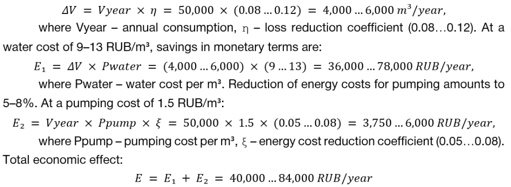 Calculation of the economic effect for an enterprise is based on an annual water consumption of 50,000 m³. Reduction of losses from accurate metering amounts to 8–12%, which gives water savings: