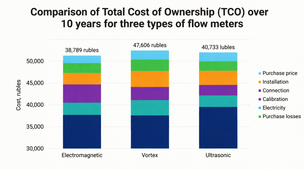 The cost of ownership of the ultrasonic flow meter URSV-110 includes: acquisition 18,400 RUB, installation (without stopping the process) – 3,000 RUB, connection – 3,500 RUB, verification (3 times at 3,000 RUB) – 9,000 RUB. Electricity consumption 12 W over 10 years: 1,051 kWh, cost: 1,051 × 6.50 = 6,833 RUB. Pressure losses are absent (clamp-on type). Total TCO: 18,400 + 3,000 + 3,500 + 9,000 + 6,833 + 0 = 40,733 RUB.