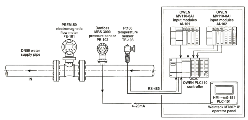 Ultrasonic flow meters are indispensable in situations where cutting into the pipeline is impossible (operating productions, pipelines under pressure, hazardous environments) or mobility of measurements is required (temporary accounting, diagnostics). The clamp-on installation type allows carrying out measurements without stopping the process, which is critical for continuous productions. The device is universal – suitable for any liquids, including distilled water, oils, solvents. Limitations – high cost, sensitivity to the state of the pipe surface and presence of deposits. To illustrate the practical application of flow meters in an automation system, Figure 3 presents a diagram of a water accounting unit at an industrial enterprise, showing: water supply pipeline DN50, electromagnetic flow meter PREM-50, pressure sensor Danfoss MBS 3000, temperature sensor Pt100, OWEN MV110-8AI input modules, OWEN PLC110 PLC, and Weintek MT8071iP operator panel.