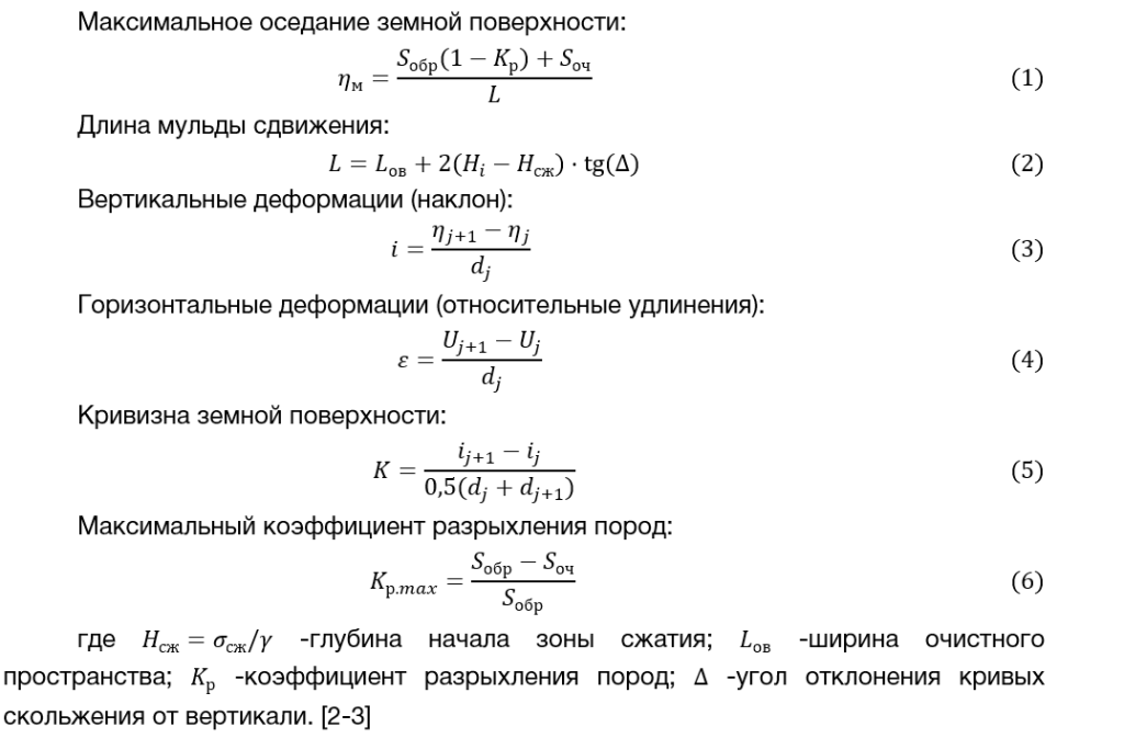 Предложена методика прогнозного расчёта оседания земной поверхности (формулы 1–6), учитывающая переслаивание пород и не ограниченная условиями конкретного месторождения.