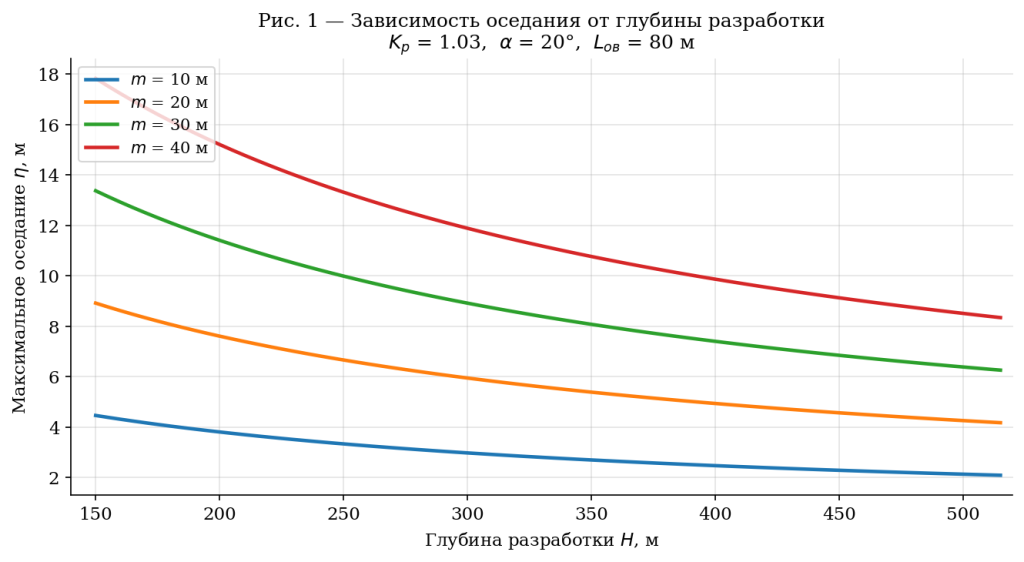 Для количественной оценки ожидаемых деформаций земной поверхности выполнен прогнозный расчёт максимального оседания η по формуле (1) при варьировании глубины разработки H от 150 до 510 м и вынимаемой мощности рудного тела m = 10, 20, 30, 40 м. Остальные параметры приняты постоянными: K_р = 1,03; α = 20°; L_ов = 80 м. Результаты расчётов представлены на рисунке 1.
