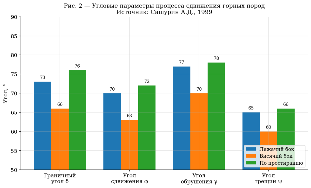Угловые параметры сдвижения являются ключевыми характеристиками при построении предохранительных целиков и определении размеров зон влияния горных работ. На основе обобщения данных натурных наблюдений на рудниках чёрной металлургии Урала (Сашурин А.Д., 1999) для трёх направлений -лежачий бок, висячий бок и по простиранию -установлены средние значения граничного угла δ, угла сдвижения φ, угла обрушения γ и угла трещин ψ, представленные на рисунке 2.