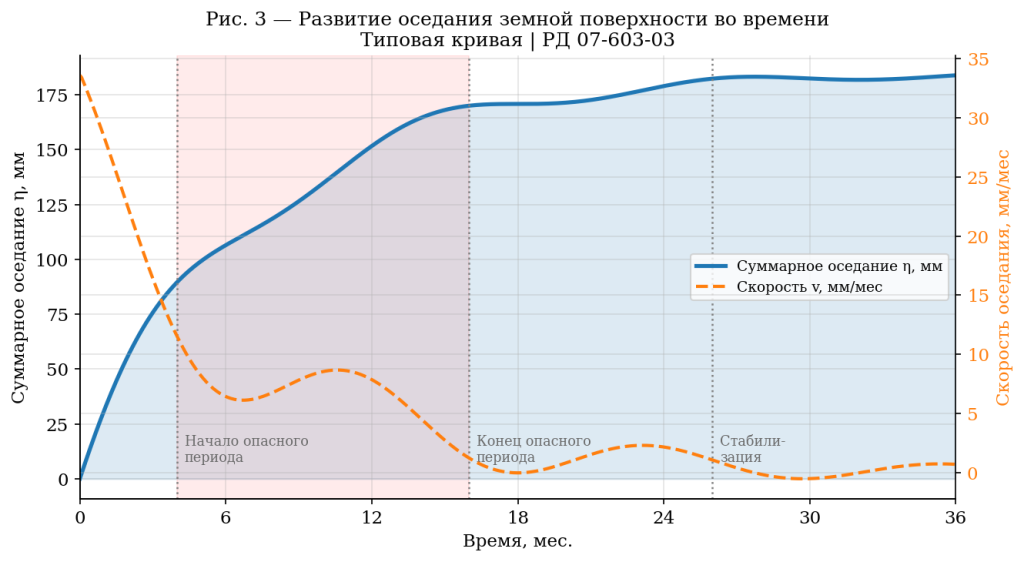 Кривая оседания описывается экспоненциальным законом с наложенными сезонными колебаниями, затухающими со временем. Активная фаза (0–24 мес.) обеспечивает около 95% суммарного оседания; при этом наибольшая интенсивность деформаций приходится на первые 6–10 месяцев после достижения горными работами горизонта наблюдений.  Скорость оседания в опасный период достигает 15–25 мм/мес., что в 10–15 раз превышает фоновый уровень затухающей фазы (< 1,5 мм/мес.). Полученная зависимость обосновывает дифференцированную периодичность наблюдений: в опасный период -не реже 2 раз в месяц, в затухающий -1 раз в полгода, в соответствии с требованиями РД 07-603-03. Скоростные характеристики деформационного процесса при v_отр = 5–10 м/мес.