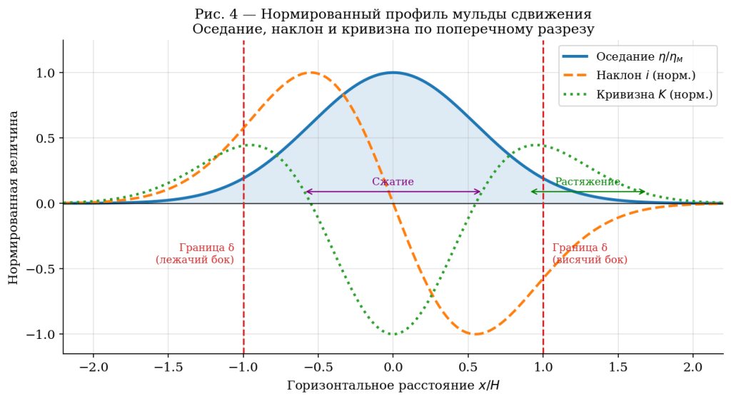 Для понимания пространственной структуры деформаций в пределах мульды сдвижения рассмотрен нормированный поперечный профиль, отражающий одновременно три деформационных показателя: оседание η, наклон i и кривизну K. Профиль построен на основе гауссовой аппроксимации функции оседания с параметрами, соответствующими типичным условиям рудников с пологим залеганием залежи. На рисунке 4 нормированные кривые приведены в единой системе координат x/H.