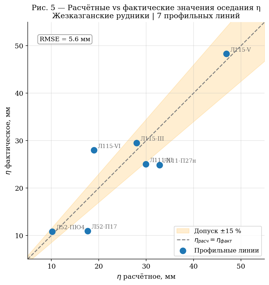 Верификация предложенной расчётной методики выполнена путём сопоставления вычисленных по формулам (1)–(4) значений максимального оседания ηрасч с фактическими данными ηфакт, зафиксированными при инструментальных нивелировках по 7 профильным линиям Жезказганского и Восточно-Жезказганского рудников. Результаты сопоставления представлены на рисунке 5 в виде диаграммы рассеяния; пунктирной линией показана идеальная прямая ηрасч = ηфакт, оранжевой полосой -коридор допуска ±15%.
